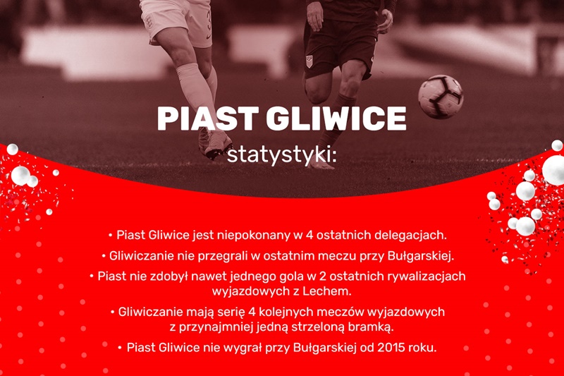 Piast Gliwice nie wygrał żadnego meczu wyjazdowego z Lechem Poznań od 2015 roku. W poprzednim sezonie rywalizacja tych drużyn przy ulicy Bułgarskiej zakończyła się podziałem punktów i bezbramkowym remisem. Mimo to było to już 2 spotkanie wyjazdowe, w którym Piast Gliwice nie strzelił gola w Poznaniu. Statystyki wyraźnie nie przemawiają na korzyść tego zespołu, jednak nie ma wątpliwości, że stać ich na niespodziankę przy Bułgarskiej. Statystyki wskazują, że Piast nie przegrał w 4 ostatnich delegacjach i zaliczył w tym czasie aż 2 zwycięstwa. Dodatkowo warto wspomnieć, że w każdym z tych meczów podopieczni Waldemara Fornalika strzelili przynajmniej jednego gola. Zakłady bukmacherskie z pewnością wezmą to pod uwagę.