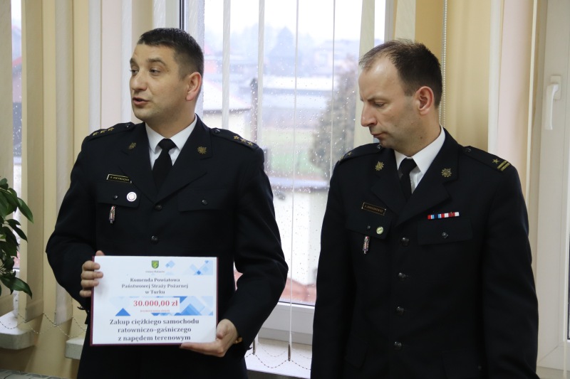 W zadaniach inwestycyjnych pojawiła się dotacja dla KP PSP w Turku. Na samochód ratowniczo-gaśniczy z napędem na cztery koła postanowiono przeznaczyć 30 tys. zł. Przekazana kwota jest odpowiedzią na prośbę jednostki i pozwoli na zakup wozu w 2019 roku. Stąd też wizyta nas sesji Komendanta Powiatowego kpt. Piotra Pietruchy oraz p.o. z-cy Komendanta Powiatowego mł.bryg. Arkadiusza Janaszkiewicza, którzy odebrali z rąk wójta i przewodniczącego rady symboliczny czek.