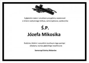 Józef Mikosik pełnił funkcję gospodarza wsi od 2000 roku, będąc jednocześnie najstarszym sołtysem w gminie. Niedawno po dwóch dekadach sprawowania tej zaszczytnej funkcji złożył rezygnację. Dziś o śmierci zasłużonego sołtysa, samorządowca, społecznika poinformowali samorządowcy gminy Malanów.