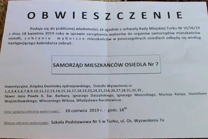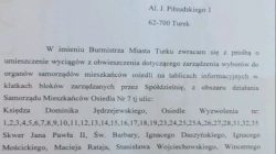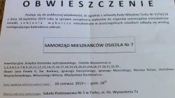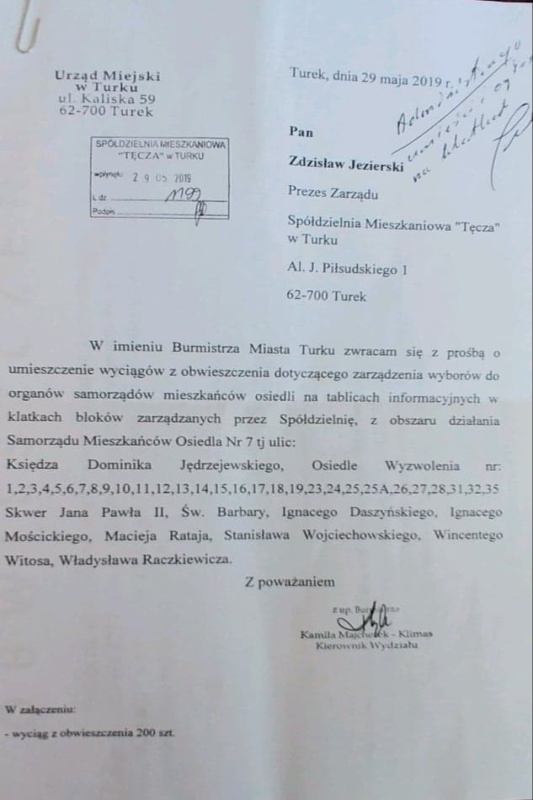 Poniżej załączamy zdjęcia nadesłane do redakcji Turek24. Pierwsze prezentujące pismo z Urzędu Miejskiego w Turku do prezesa SM „Tęcza” z prośbą o umieszczenie wyciągów z obwieszczeniami o wyborach do samorządów mieszkańców osiedli w klatkach bloków zarządzanych przez spółdzielnię. Drugie obwieszczenie jakie znalazło się na tablicach informacyjnych. Obwieszczenia informujące o wyborach znalazły się również na klatkach bloków SM „Rozwój” w Turku.