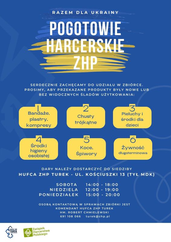 W celu realizacji zadań wynikających z harcerskiej służby Hufiec ZHP Turek organizuje zbiórkę produktów, do której zachęcamy gorąco wszystkich, którzy chcą udzielić wsparcia obywatelom Ukrainy. W ramach zbiórki można przekazać środki medyczne, koce, śpiwory, żywność długoterminowa, środki higieny osobistej, produkty i wszelkiego rodzaju środki dla dzieci. Prosimy, aby przekazane dary były nowe lub bez widocznych śladów użytkowania.