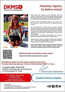 Mikołajkowa zbiórka krwi dla Agaty odbędzie się 7 grudnia w siedzibie Tureckiej Izby Gospodarczej przy ul. Żeromskiego 37 w Turku w godz. 9-14. Dzięki tej akcji Agata będzie mogła zachować ciągłość leczenia. Ten dzień będzie również okazją do zapisania się do bazy dawców szpiku Fundacji DKMS.