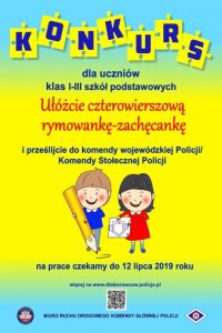W naszym województwie należy adresować je do Wydziału Ruchu Drogowego KWP w Poznaniu ul. Kochanowskiego 2a, 60-844 Poznań lub mailowo na adres maciej.bednik@po.policja.gov.pl, z dopiskiem „Rymowanka – Zachęcanka”.