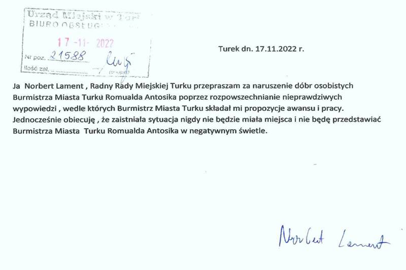 Radny Norbert Lament złożył w Urzędzie Miejskim w Turku pisemne oświadczenie, w którym przeprasza Burmistrza Miasta Turku, Romualda Antosika za rozpowszechniane nieprawdziwych informacji dotyczących burmistrza.
