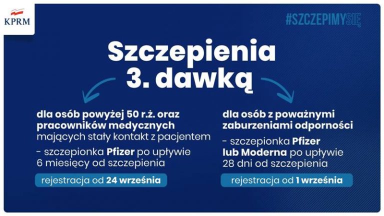 „Szczepienia 3. dawką dla osób 50+ oraz medyków – Pfizer po 6 miesiącach od szczepienia – rejestracja od 24.09 dla osób z poważnymi zaburzeniami odporności – Pfizer lub Moderna po 28 dniach od szczepienia – rejestracja od 1.09” – poinformowała KPRM.