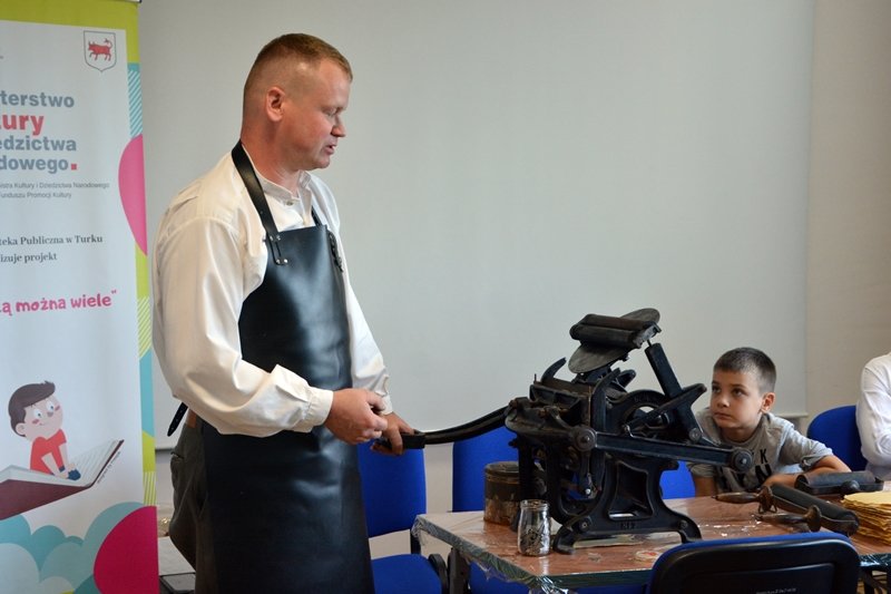 W niedzielne popołudnie, 20 października, w Miejskiej Bibliotece Publicznej im. Włodzimierza Pietrzaka odbyło się spotkanie połączone z warsztatami drukarskimi. Zajęcia przeprowadzone zostały przez samego właściciela firmy Art.-Papier, wielkiego pasjonata Flawiusza Pietrzyka.