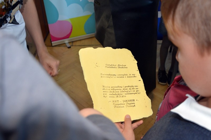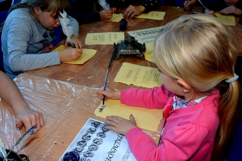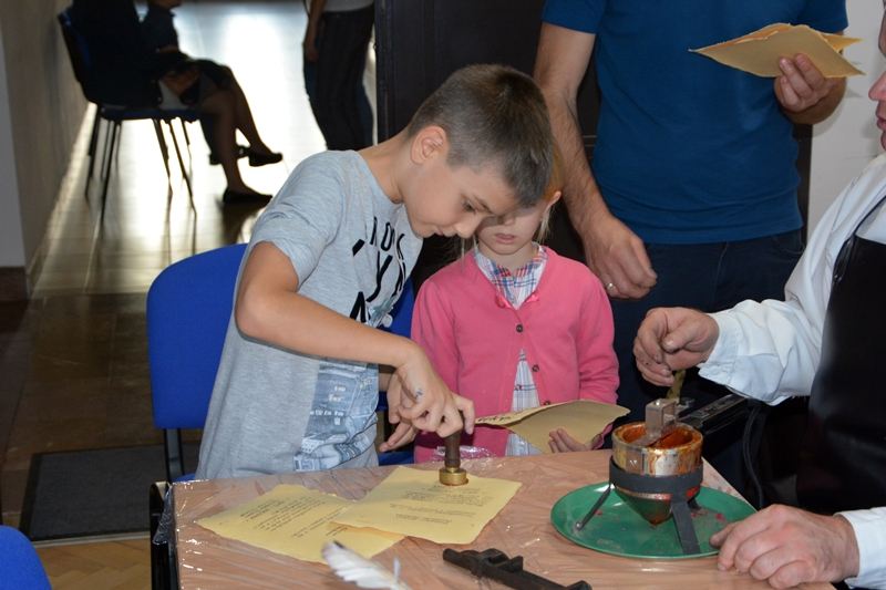 Na początku spotkania prowadzący opowiedział kilka ciekawostek na etat historii drukarstwa, mających na celu wprowadzenie w atmosferę XV wiecznej drukarni. Podczas pokazu zebrani mogli własnoręcznie wydrukować certyfikat młodszego czeladnika sztuki drukarskiej. Powstał przy użyciu zabytkowej prasy drukarskiej oraz wypisać go gęsim piórem, a następnie podbić specjalną pieczęcią. Warsztaty cieszyły się dużym zainteresowaniem ze strony wszystkich zebranych, co zauważyć można było po ilości zadawanych pytań.