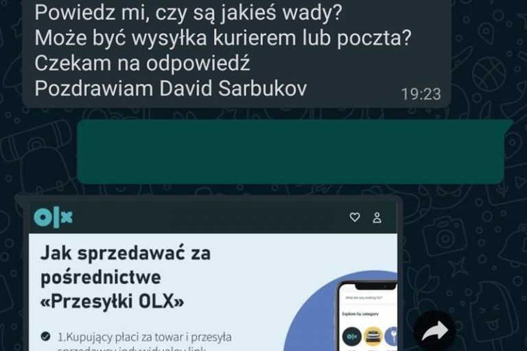 Bądź czujny, gdy otrzymasz wiadomość od kupującego, że już opłacił Twój przedmiot i prosi o wejście w link do rzekomego potwierdzenia Płatności OLX. Możesz być pewien, że to oszustwo, szczególnie, gdy wiadomość przesyła poza OLX, np. za pośrednictwem komunikatora Whatsapp.