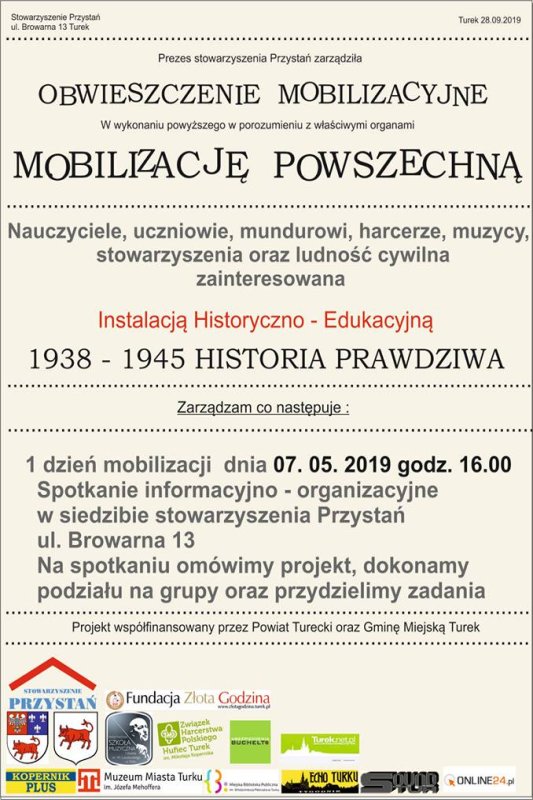 Po raz trzeci Stowarzyszenie Przystań chce przystąpić do realizacji projektu Instalacja historyczno-edukacyjna „1938 -1945 Historia prawdziwa”. Okazją do powtórzenia wydarzenia jest 80. rocznica wybuchu II wojny światowej. W związku z czym ogłasza mobilizacje powszechną dla mieszkańców miasta i powiatu tureckiego.
